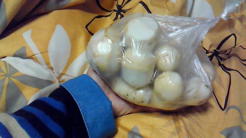 朝、畑に行きましたら、お向かいのワカさんとばったりお会いしました。 「味見してみてください」 と、みかんを2つ差し上げましたらば、 \夕刻、サトイモがやってきました/ 皮もむいていただいて。なんとありがたいことでしょう。 ♪ とかく女の好むもの~…