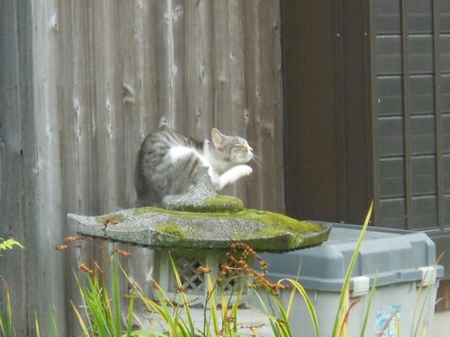 鉄道が運休になる大雨です。 昨夜は稲光の眩しさで、目を覚ましました。 自宅は高台にあるので、浸水のおそれはありません。 途中、道が水没していないことを祈りながら実家に向かいました。 雨の隙間に到着いたしましたらば、 石灯籠の上でくつろぐブチさん…